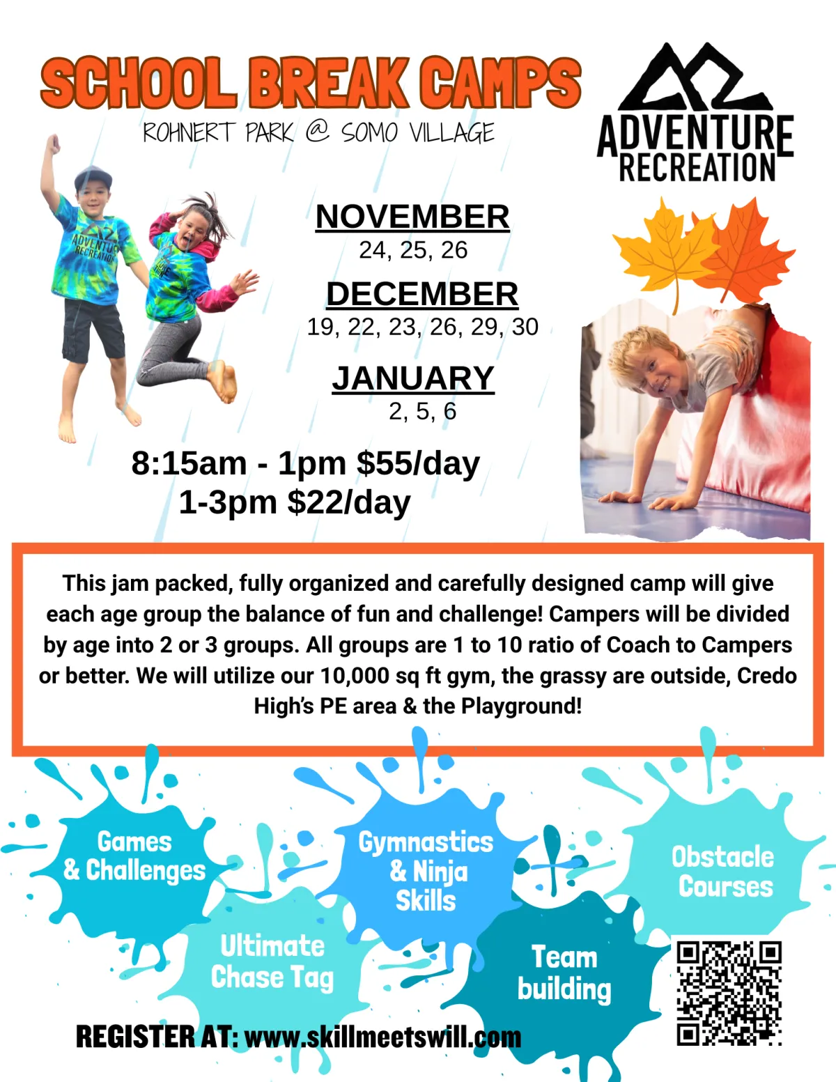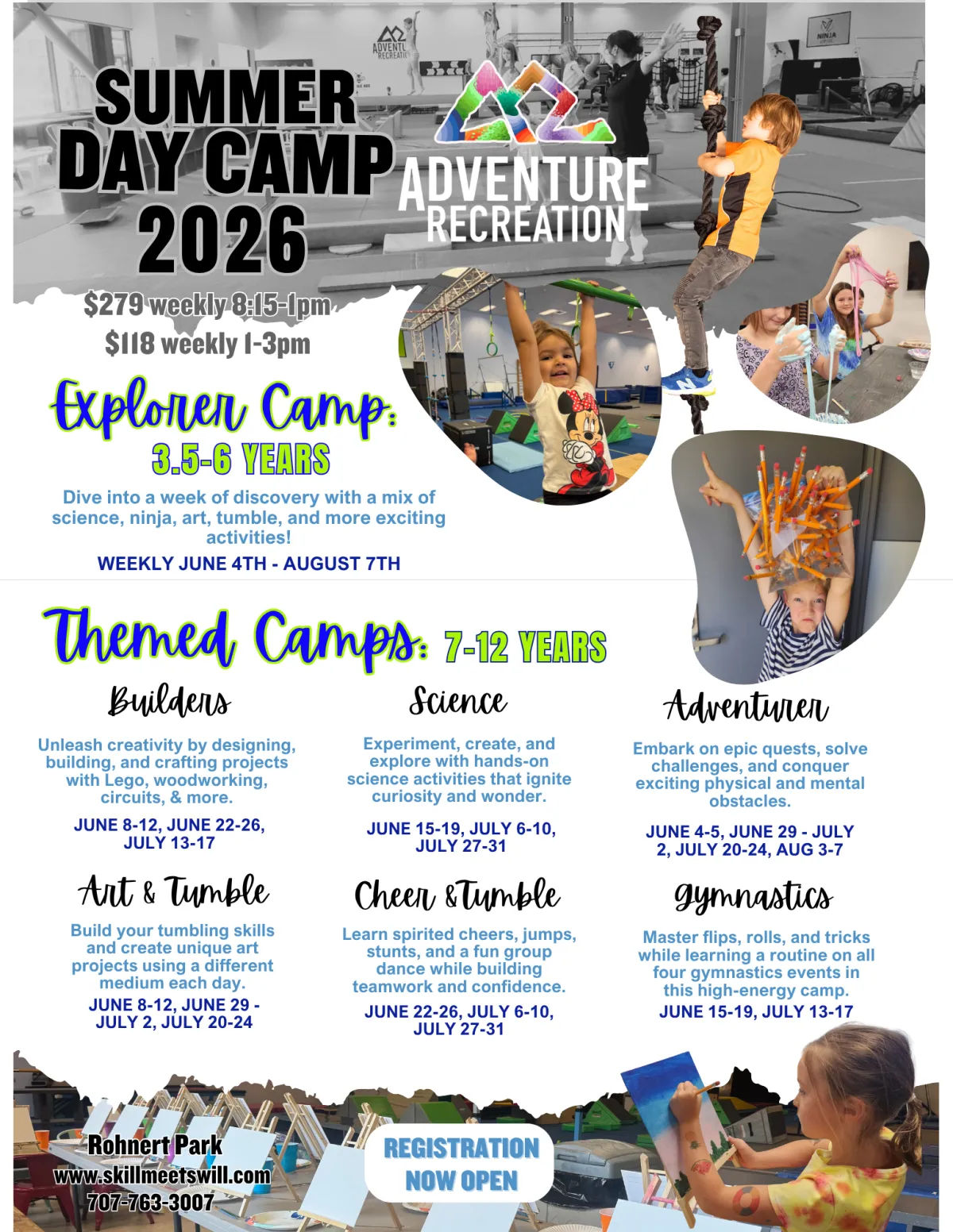 Our New location offers SO much more! 1500 Valley House Drive Rohnert Park, CA 94928. Our camps offer small group sizes and group the kids by age OR by theme! Our super fun coaches help every camper have a great time by leading unique and creative activities, games, science, art and so much more. We offer camps all year round when school is out! Summer Break, Fall Break, Winter Break, Ski Week, Spring Break and more.